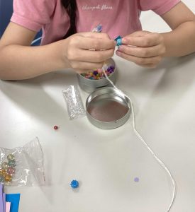 ペットボトルに穴をあけて、糸とビーズを通します♪