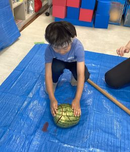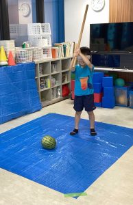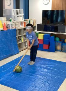 「もっと右だよ!」「あと1歩前~」などお友達の声をたよりにスイカに狙いをさだめます!