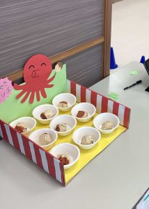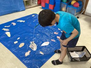 魚の裏に磁石が貼ってあり、クリップがついた竿で釣り上げます🐟