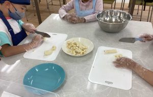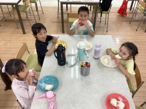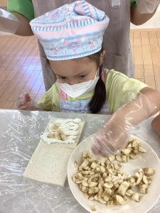 食パンの上にホイップクリームを絞って、フルーツを丁寧にのせていきます☆