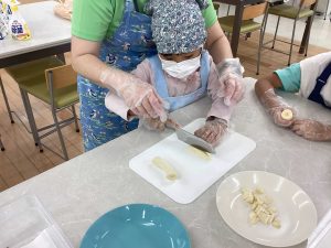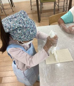 食パンの上にホイップクリームを絞って、フルーツを丁寧にのせていきます☆