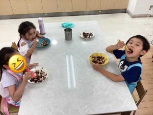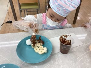 上からチョコをかける児童もいれば、カップの中にバナナを入れてチョコをつける児童もいて、個性が見られました![]()