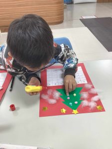 ツリーの色を黄色にしたり、ポンポンをつけたり、キラキラしたテープを貼ったり・・・