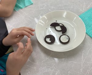 まずは、おやつ作り!オレオクッキーを使ってコウモリの形にしていきます🦇