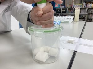 容器の中にマシュマロを入れて、空気を抜いていくと…なんと!大きくなった~。