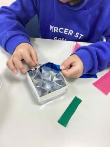 まずは、枠組みの牛乳パックに様々な形に丸めた銀色の折り紙を敷き詰めて…