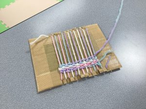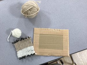 段ボールに切れ目を入れて、縦糸と横糸を順番に編むだけで簡単に作れます。