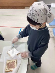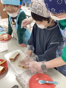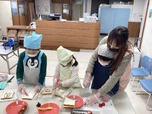 いちごをのせて、食パンでサンドしてカットします。断面にいちごが見えるように工夫しました![]()