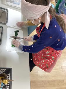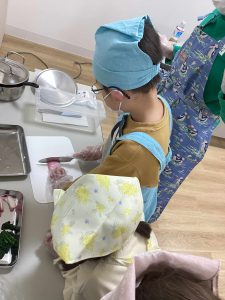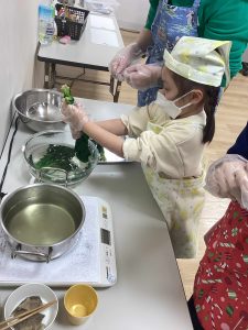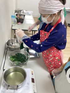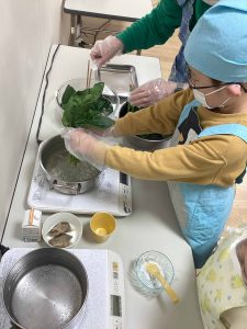 まずはほうれん草を茹でて、しぼる作業から行いました![]()