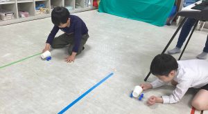 最後には紙コップで磁石を使った車を作りどうしたら思い通りに動くかを児童達自身で考えながら競争をしました。