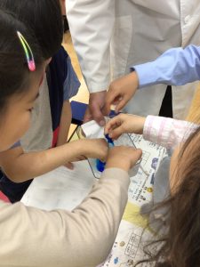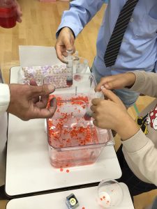 赤い液体をスポイトでポタポタ落とすと、プルンとしたイクラのような粒が完成!