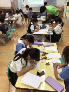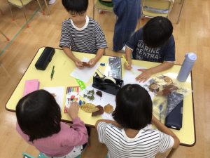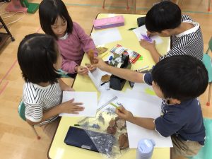 イラストレーターのしらいしののこ先生と今月は落ち葉を使って「フロッタージュ」に挑戦しました。