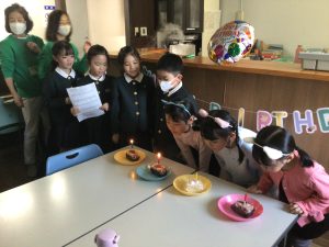 ハッピーバースデーの歌を歌い、ケーキのろうそくを消すと、お部屋は大きな拍手、心温まるお誕生日会でした。