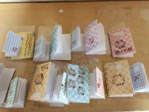 白い紙を切ったものに、折り紙で作った表紙を貼り、かわいいスタンプ押して、大小オリジナルのノートができあがりました。
