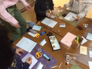 白い紙を切ったものに、折り紙で作った表紙を貼り、かわいいスタンプ押して、大小オリジナルのノートができあがりました。