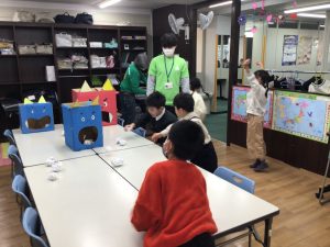 豆まきは子どもたちにとって楽しい遊びとなり、ポイント制の競技形式で大いに盛り上がりました。