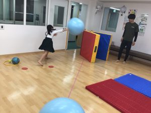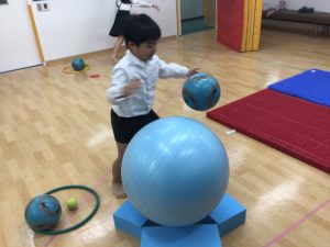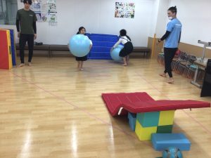 大きなバランスボールをマットに当てて弾ませたり、普段は思いつかないような使い方を教えていただき、スタッフも新しい発見にいつも驚きます。