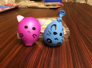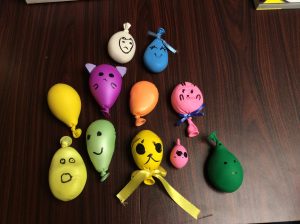 風船に小麦粉を詰めてスクイーズのお人形を作りました。