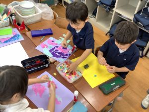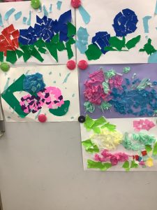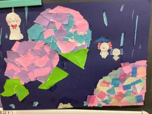 それを、ののこ先生が持ってきてくださった、この季節らしい紫陽花の写真と見本を見ながら、色画用紙にのせて、それぞれの花を咲かせます。![]()