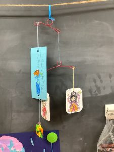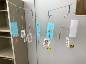 今回は笹に飾るのではなく、モビール風にしたので、短冊がいっそう風に揺れて涼しげです。(^^)/~~~