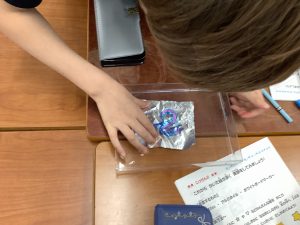 メインはアルミホイルに書いた絵が水に浮く❔という実験です。