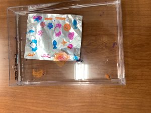 アルミホイルにホワイトボードマーカーで好きな絵を描いて水に浮かべます。