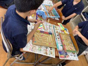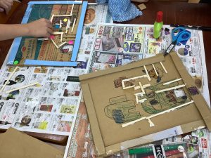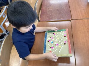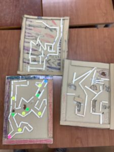 段ボールに割りばしを自由に切って貼って、迷路をつくり、その上をビー玉でスタートからゴールまで転がします。