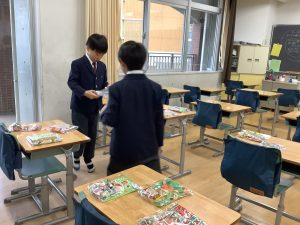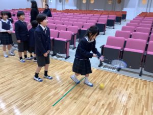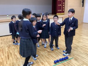 今年は講堂を使うことができたので、前半は「ボッチャで的あてクリスマスバージョン」「テ二ピンボールリレー講堂バージョン」を行いました。