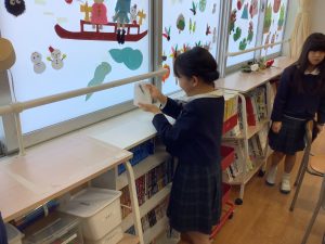 本のやぶれてしまっているところをテープで補修したり、ブロックを一つづつ丁寧に拭いたり、最後はアルコールティッシュで床をふきふき!