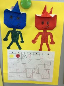 折り紙で折った鬼や、色鉛筆で描いた鬼、みんなそれぞれの感性で作っています。