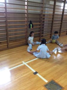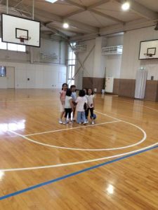 体育館では、2つのグループに分かれて、1つのグループは鬼ごっこ、もう一つのグループは輪になって座りながらボール投げをし、楽しそうな声が響きました。