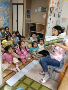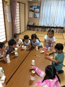 今日は人数も多くお弁当から賑やかに過ごしました。 プログラムでは紙コップでロケットを作り、夏休みに関する絵本の読み聞かせもしました。 体育館では、縄跳び、ボール遊びなどでたっぷり遊べました。