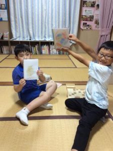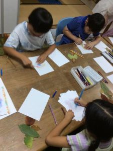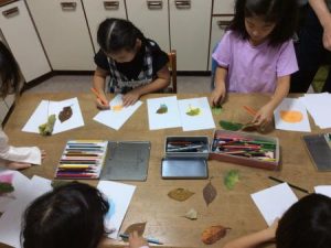 それぞれ好きな色で葉っぱの葉脈や輪郭をこすりだしして、葉っぱをセロテープで貼って、世界に一つだけの図鑑ができ上がりました。