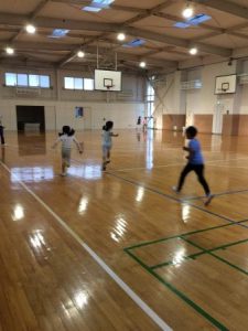 体育館で遊ぶ時間をたっぷりとることができたので、1,2年生みんな一緒に汗ばみながら、鬼ごっこで盛り上がりました。