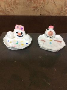 紙粘土を丸めて身体の部分を作り、ペンを使って粘土に色を付けたり、はなや帽子などのパーツを作ったり、工夫を凝らした可愛いスノーマンが出来上がりました。