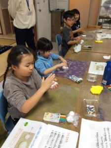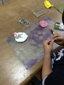 紙粘土を丸めて身体の部分を作り、ペンを使って粘土に色を付けたり、はなや帽子などのパーツを作ったり、工夫を凝らした可愛いスノーマンが出来上がりました。