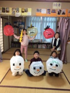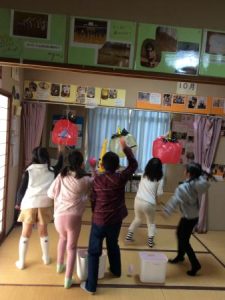 とても可愛らしい鬼は、みんなに大人気だったのですが、「鬼は外~福は内~」と大きな声で掛け声をかけながら、豆に見立てたボールを投げました。