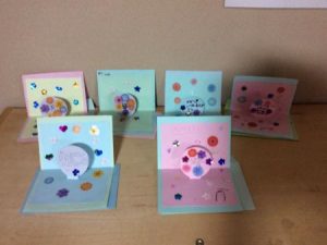 色画用紙を、お花のシールやパンチを使って色々な形に切った折り紙で飾りつけ、みんなのメッセージが飛び出すようなカードです。