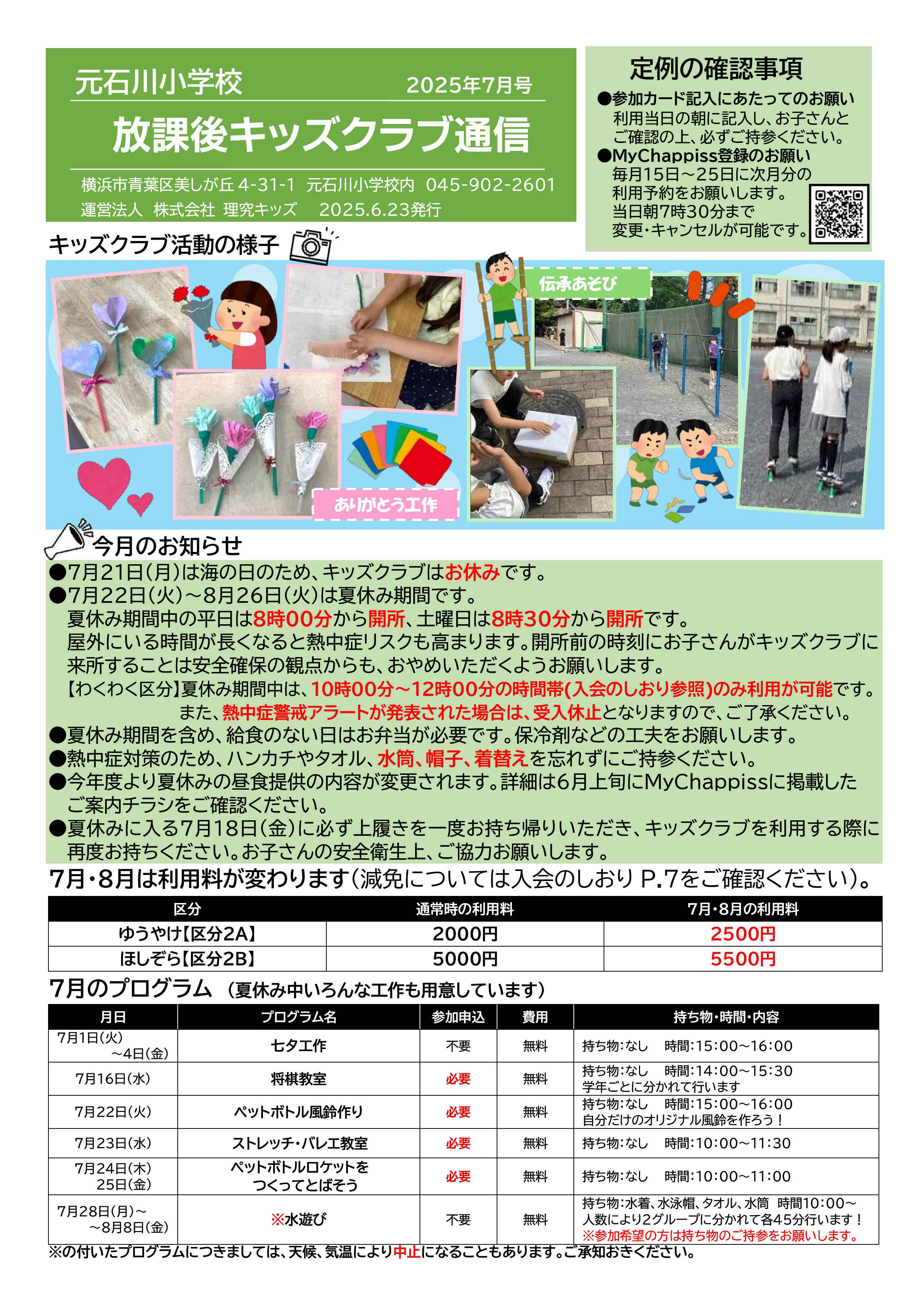※交通機関が不通となる場合もありますので、できるだけ早いお迎えをお願いします。※特別警報発表時は帰宅の安全が確保されるまで、お子さんは利用区分にかかわらず、放課後キッズクラブで留め置きとなります。