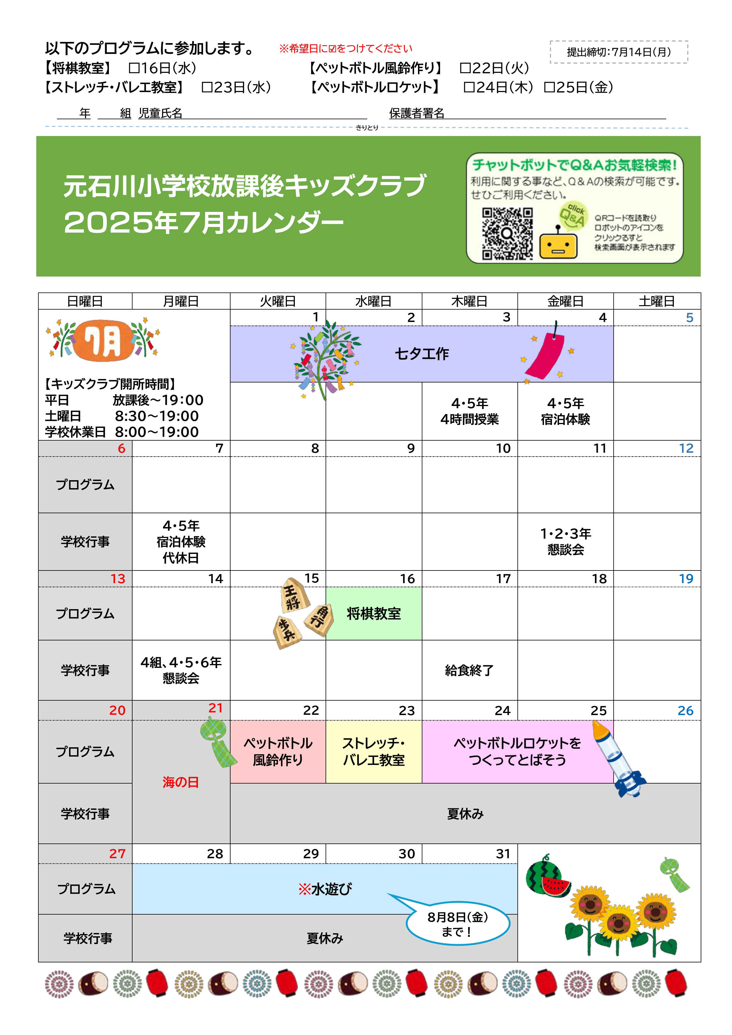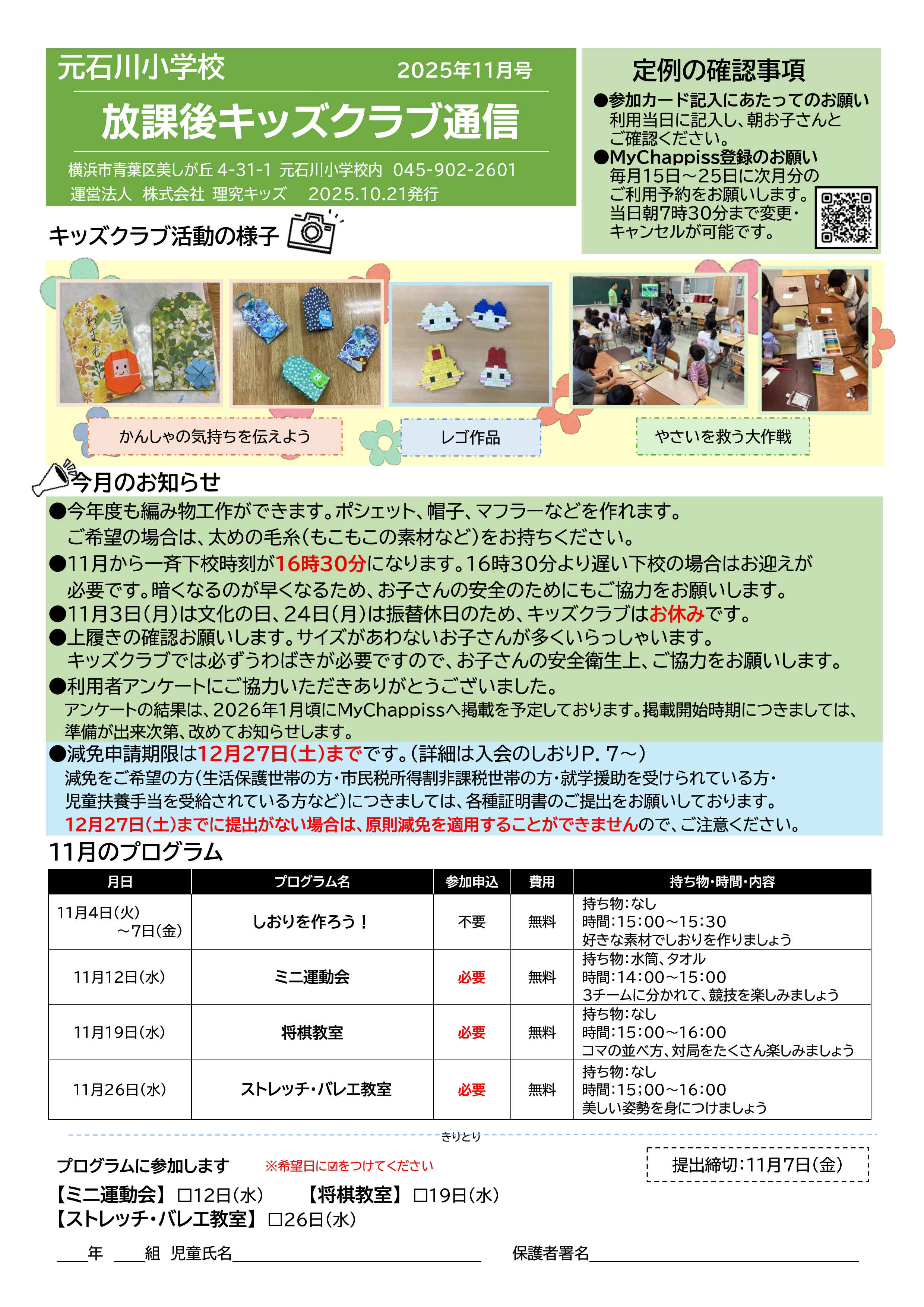 • 参加カード(利用日に「帰宅時間」「お迎えの有無」「保護者印(署名も可)」の記入あり)