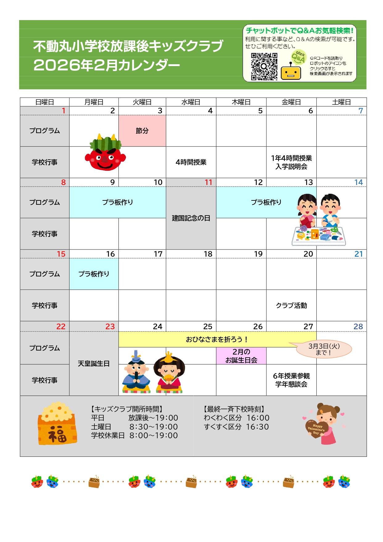「暴風警報」・「大雪警報」・「暴風雪警報」・「降灰予報」発表中は、帰宅時刻に関わらず、利用しているすべてのお子さんの保護者か代理の方のお迎えが必要です。子どもたちはお迎えが来るまで放課後キッズクラブで待機します。