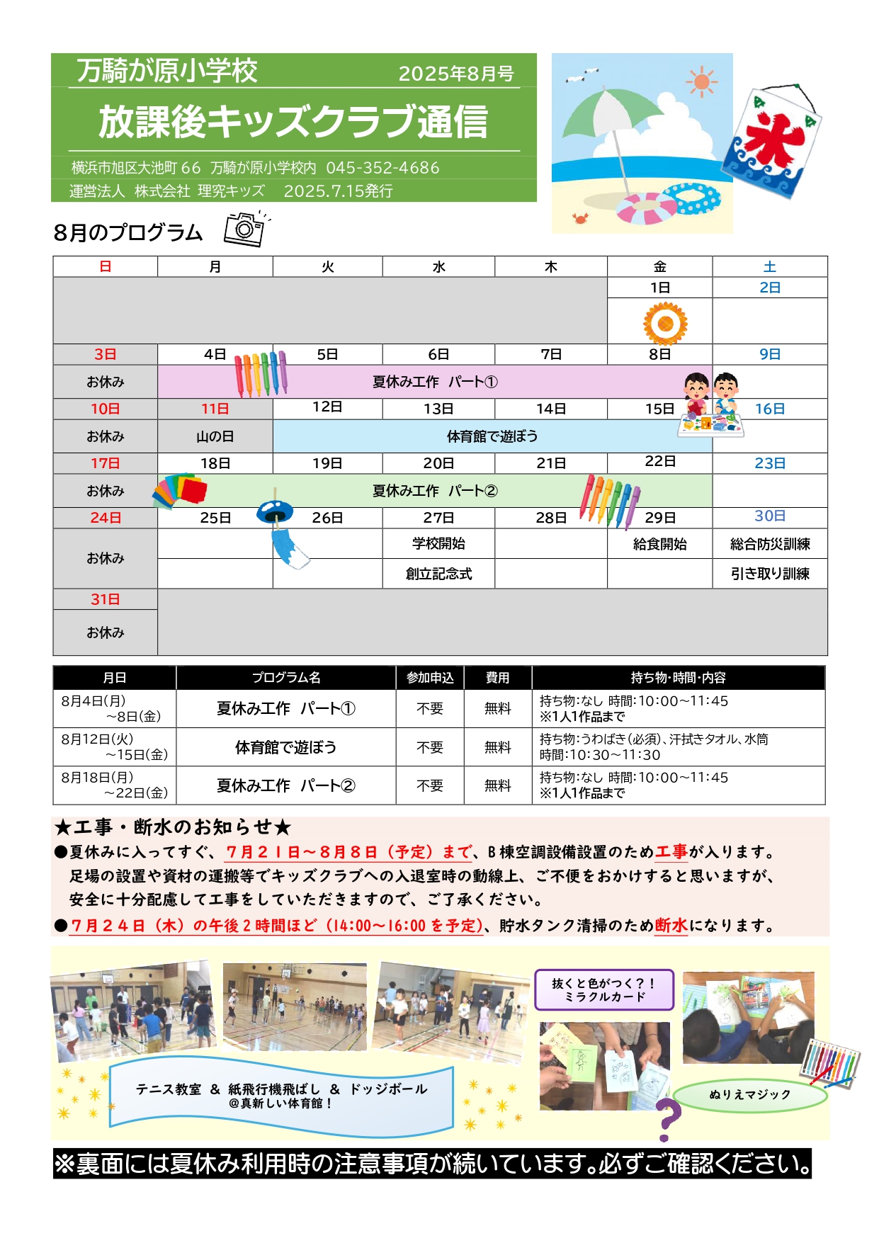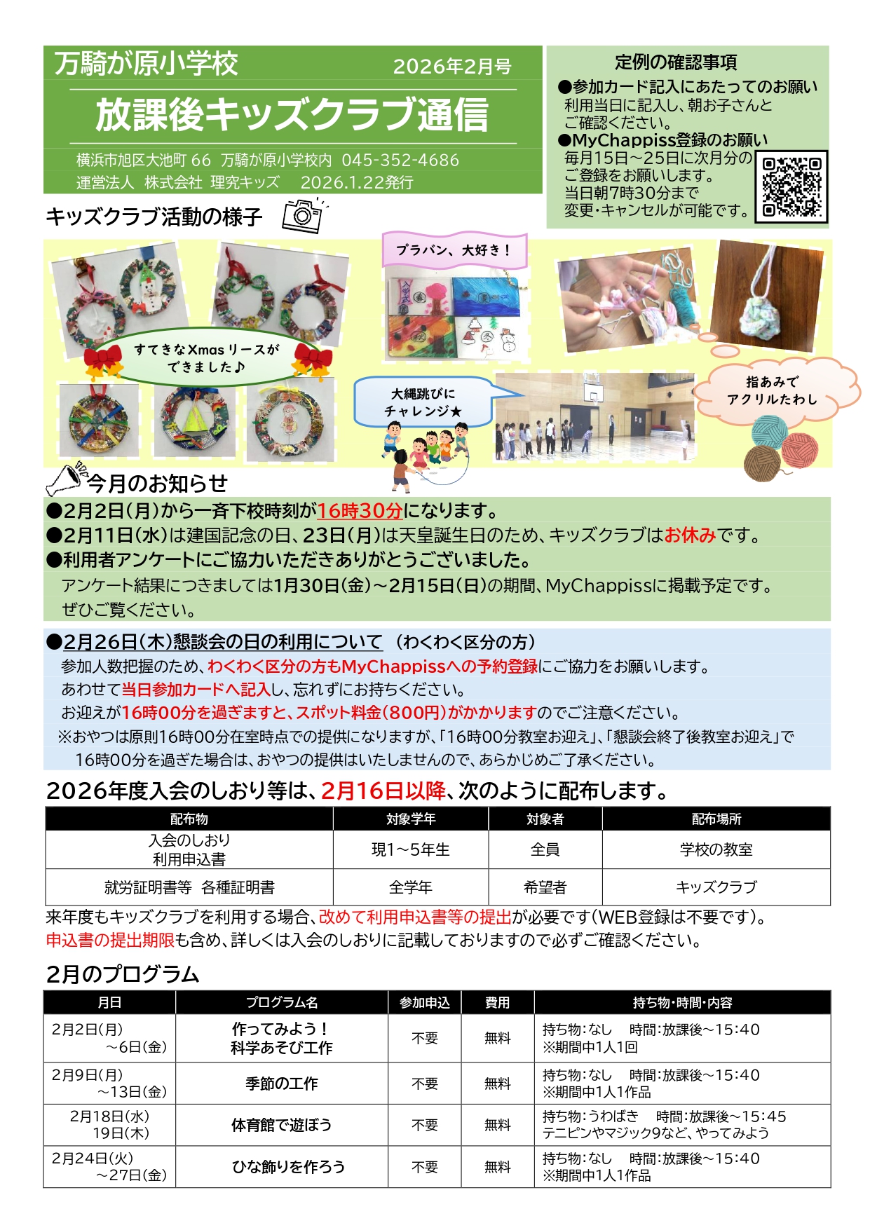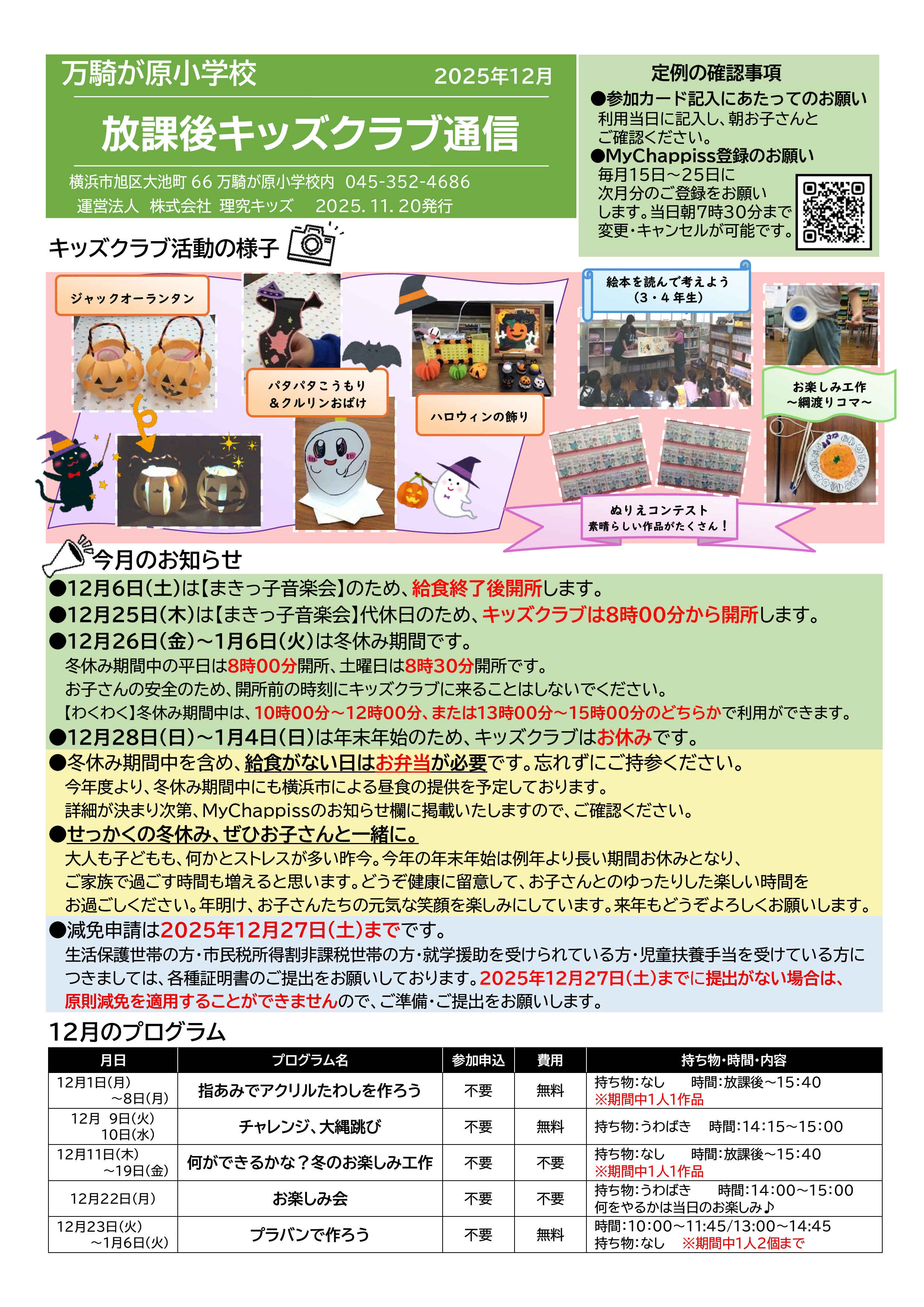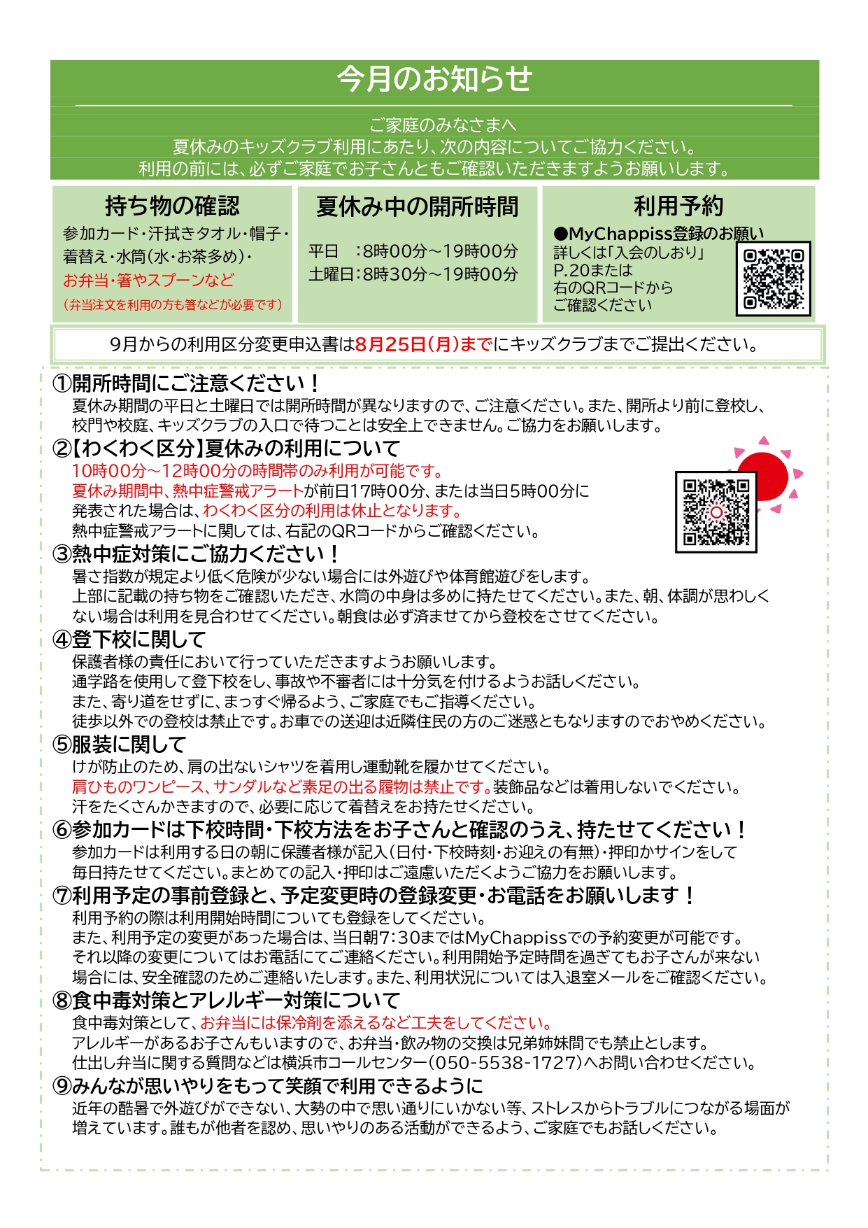 ※交通機関が不通となる場合もありますので、できるだけ早いお迎えをお願いします。※特別警報発表時は帰宅の安全が確保されるまで、お子さんは利用区分にかかわらず、放課後キッズクラブで留め置きとなります。