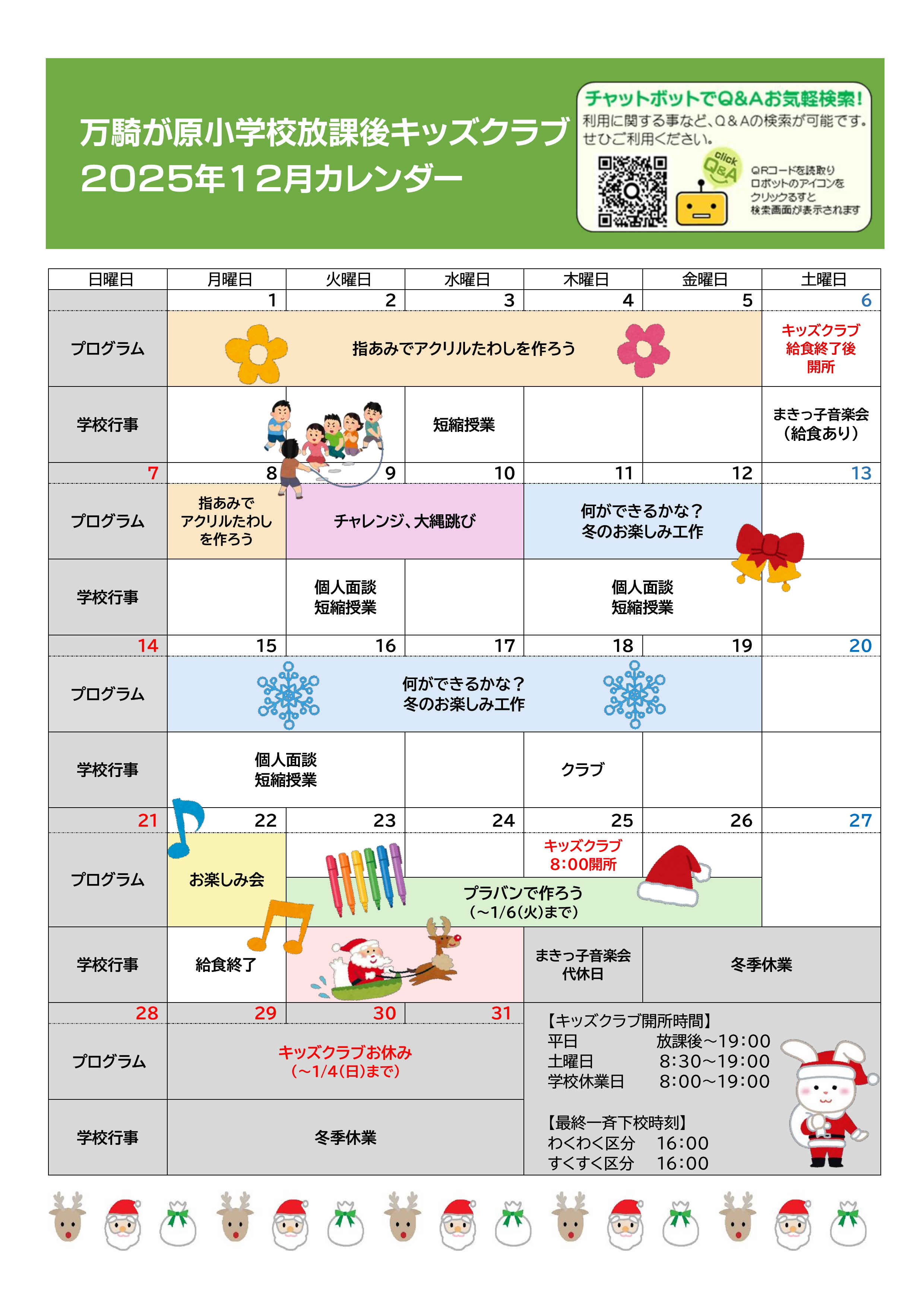 「暴風警報」・「大雪警報」・「暴風雪警報」・「降灰予報」発表中は、帰宅時刻に関わらず、利用しているすべてのお子さんの保護者か代理の方のお迎えが必要です。子どもたちはお迎えが来るまで放課後キッズクラブで待機します。