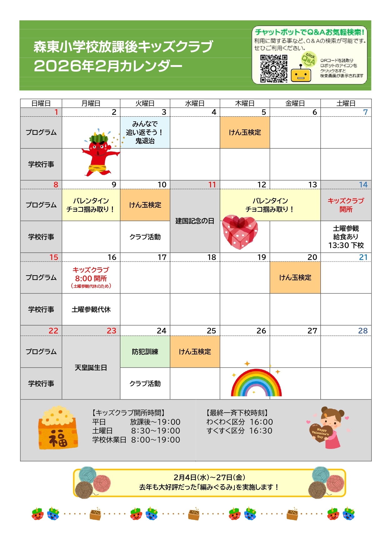 「暴風警報」・「大雪警報」・「暴風雪警報」・「降灰予報」発表中は、帰宅時刻に関わらず、利用しているすべてのお子さんの保護者か代理の方のお迎えが必要です。子どもたちはお迎えが来るまで放課後キッズクラブで待機します。