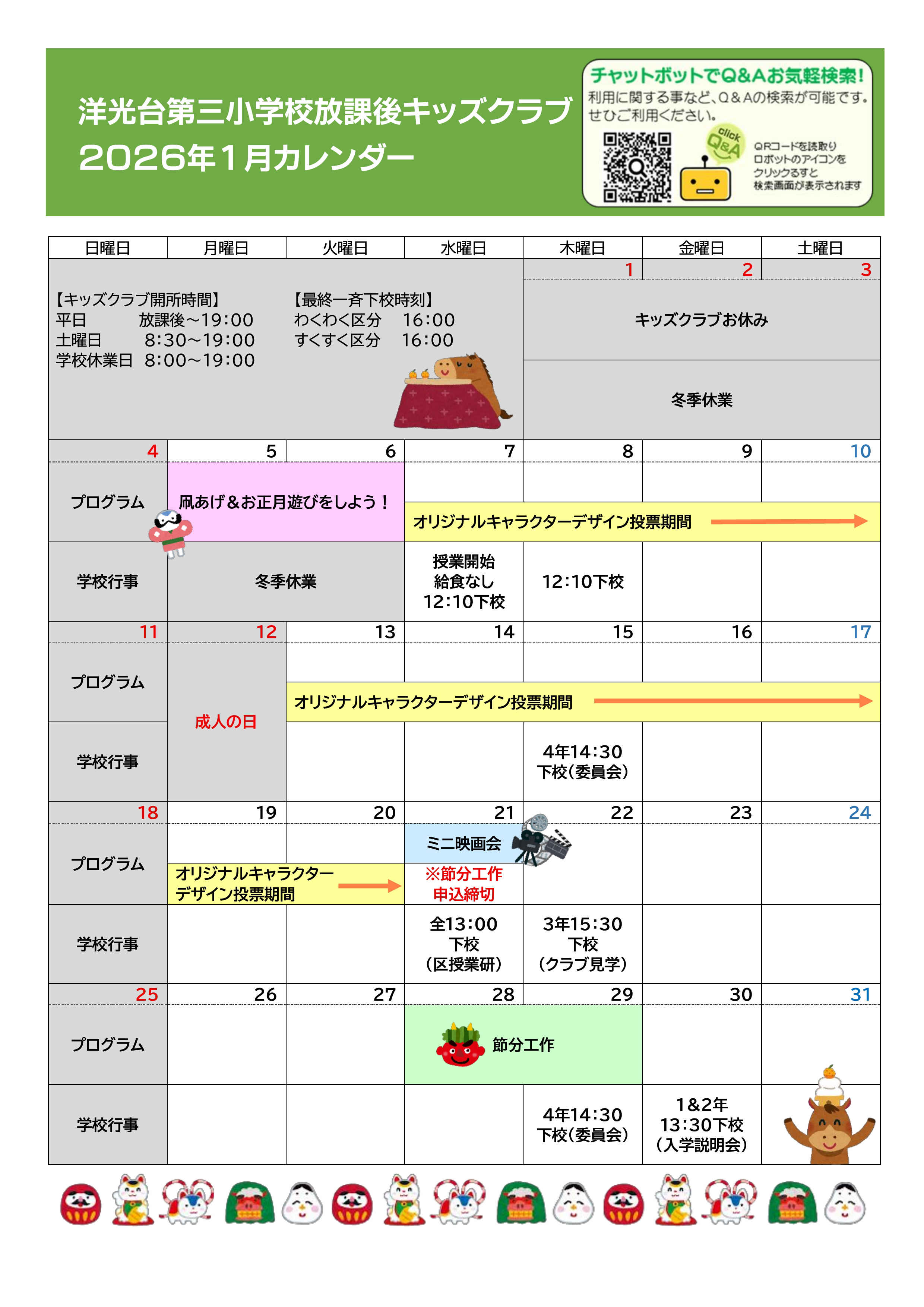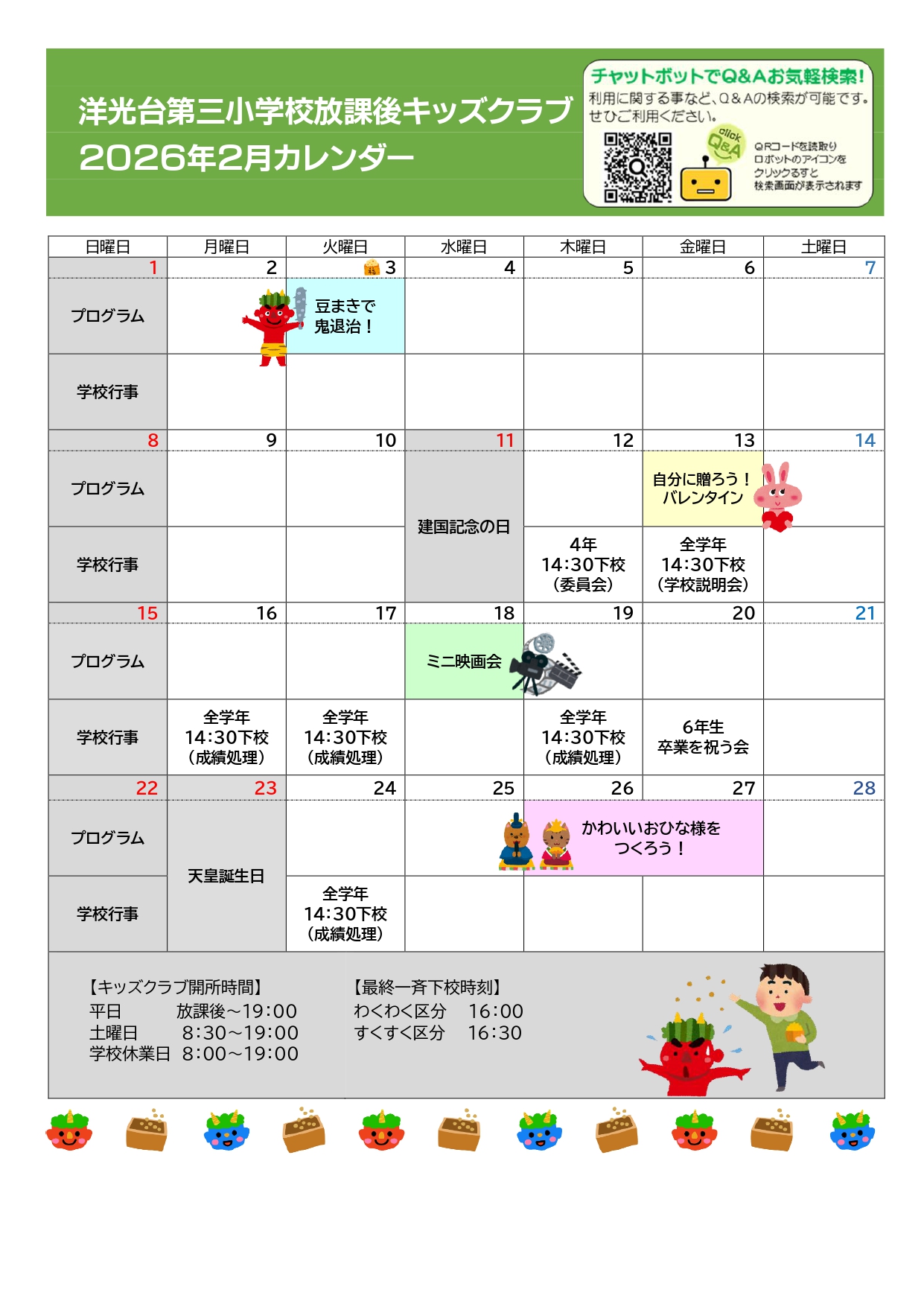 「暴風警報」・「大雪警報」・「暴風雪警報」・「降灰予報」発表中は、帰宅時刻に関わらず、利用しているすべてのお子さんの保護者か代理の方のお迎えが必要です。子どもたちはお迎えが来るまで放課後キッズクラブで待機します。