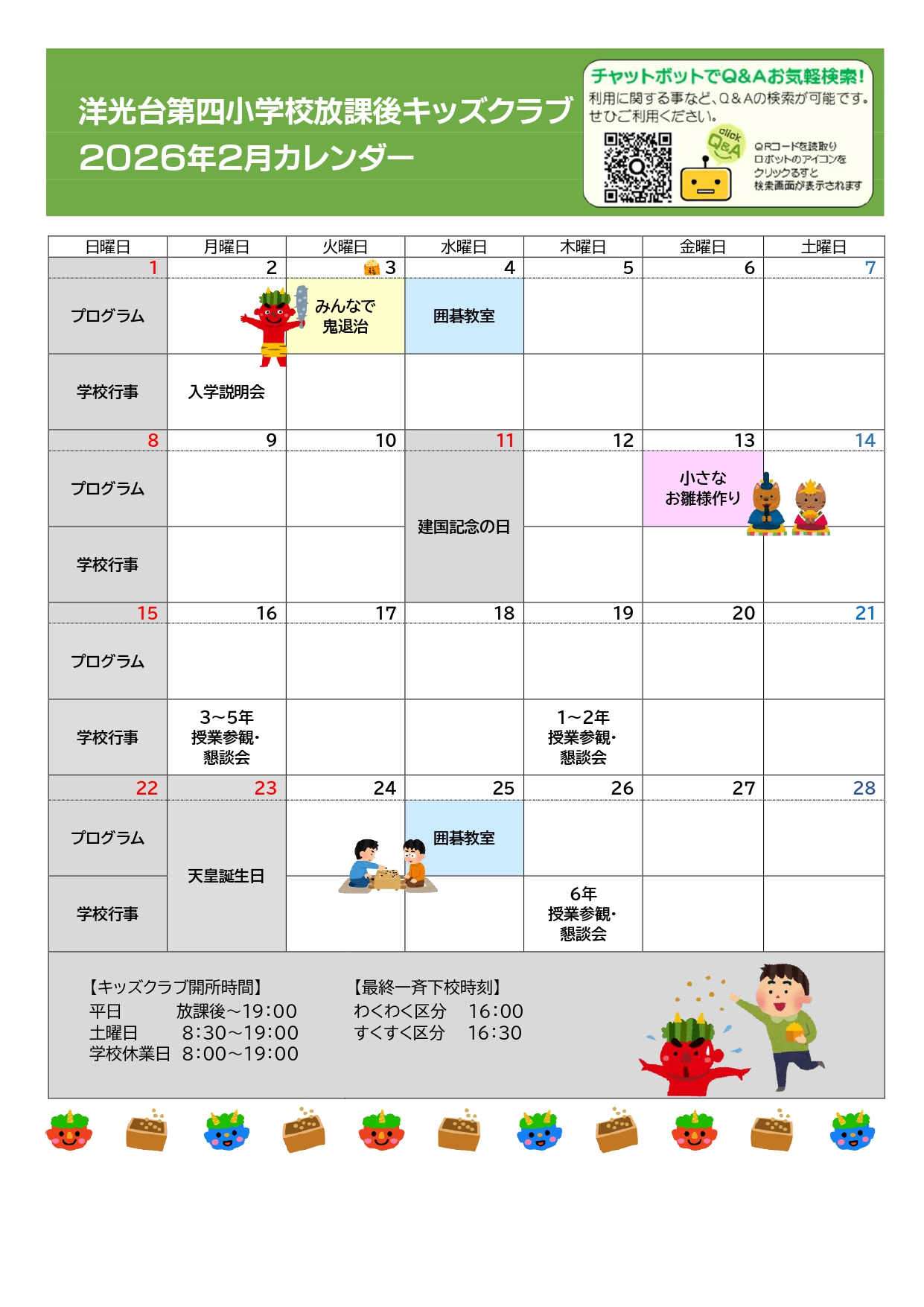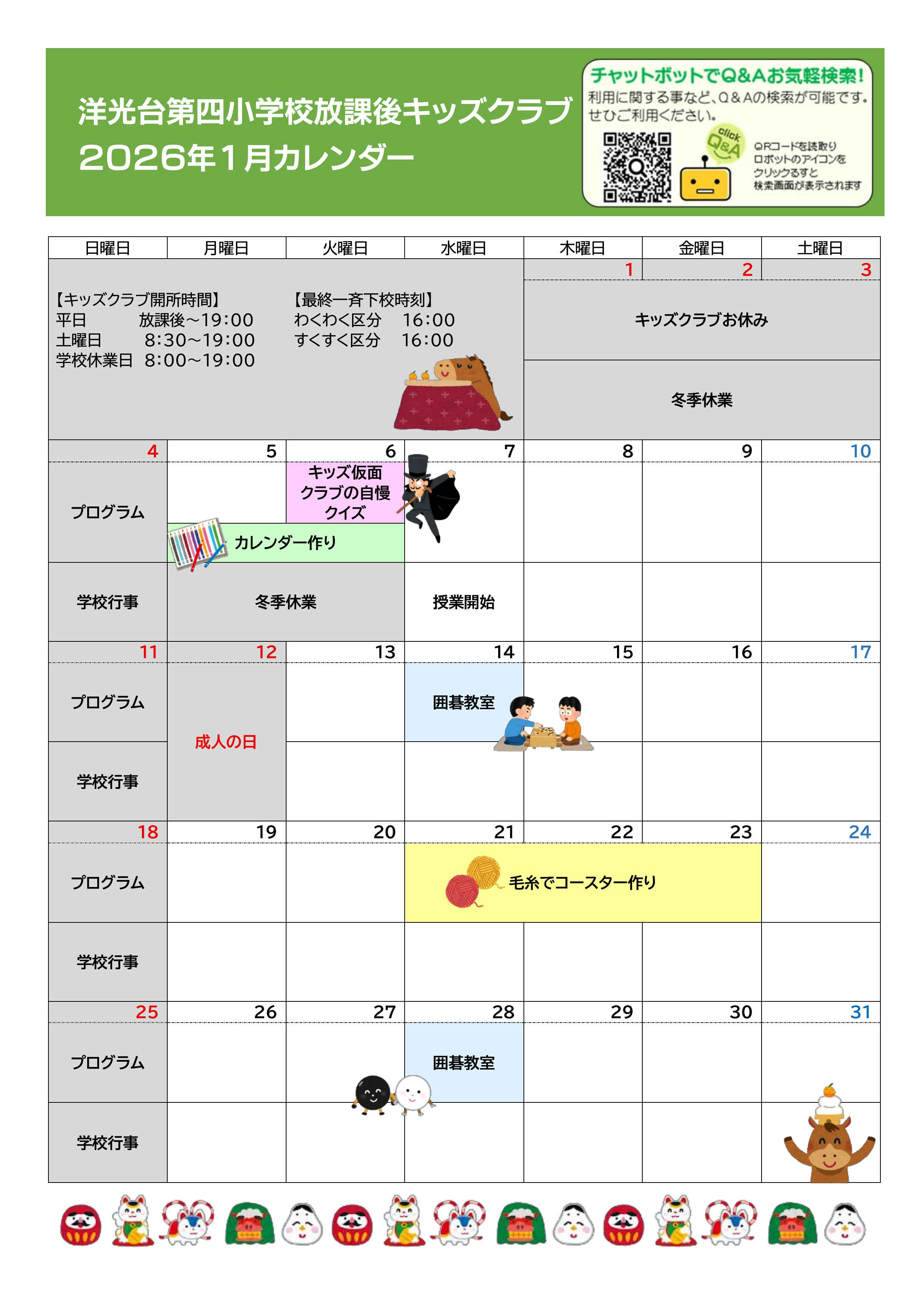 「暴風警報」・「大雪警報」・「暴風雪警報」・「降灰予報」発表中は、帰宅時刻に関わらず、利用しているすべてのお子さんの保護者か代理の方のお迎えが必要です。子どもたちはお迎えが来るまで放課後キッズクラブで待機します。