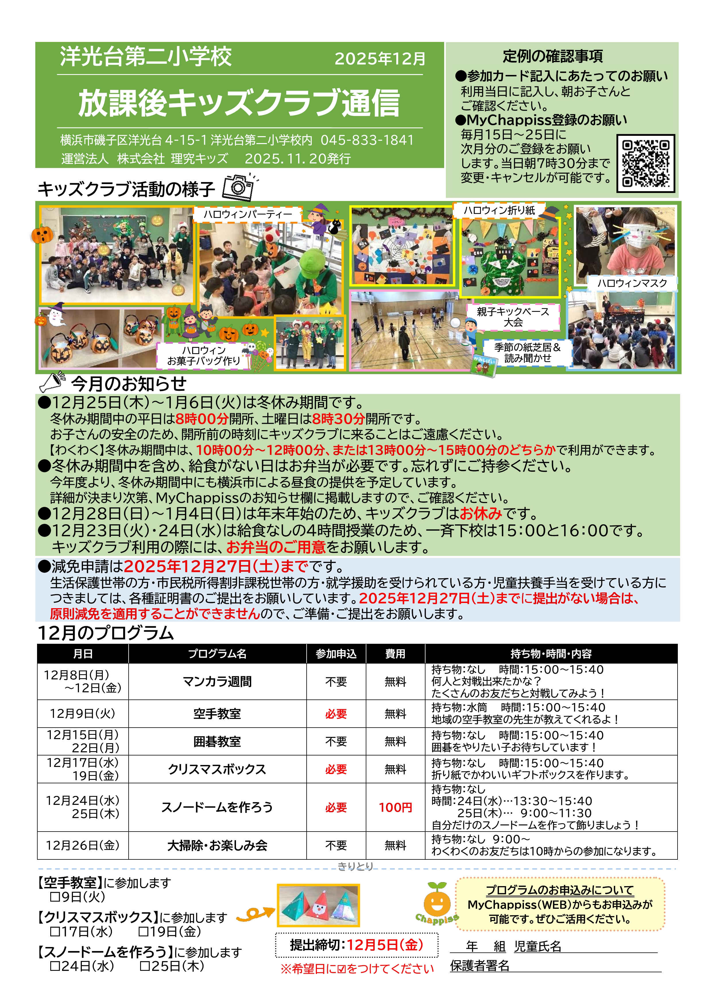 ※交通機関が不通となる場合もありますので、できるだけ早いお迎えをお願いします。※特別警報発表時は帰宅の安全が確保されるまで、お子さんは利用区分にかかわらず、放課後キッズクラブで留め置きとなります。