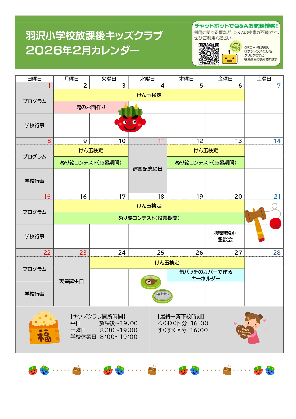 「暴風警報」・「大雪警報」・「暴風雪警報」・「降灰予報」発表中は、帰宅時刻に関わらず、利用しているすべてのお子さんの保護者か代理の方のお迎えが必要です。子どもたちはお迎えが来るまで放課後キッズクラブで待機します。