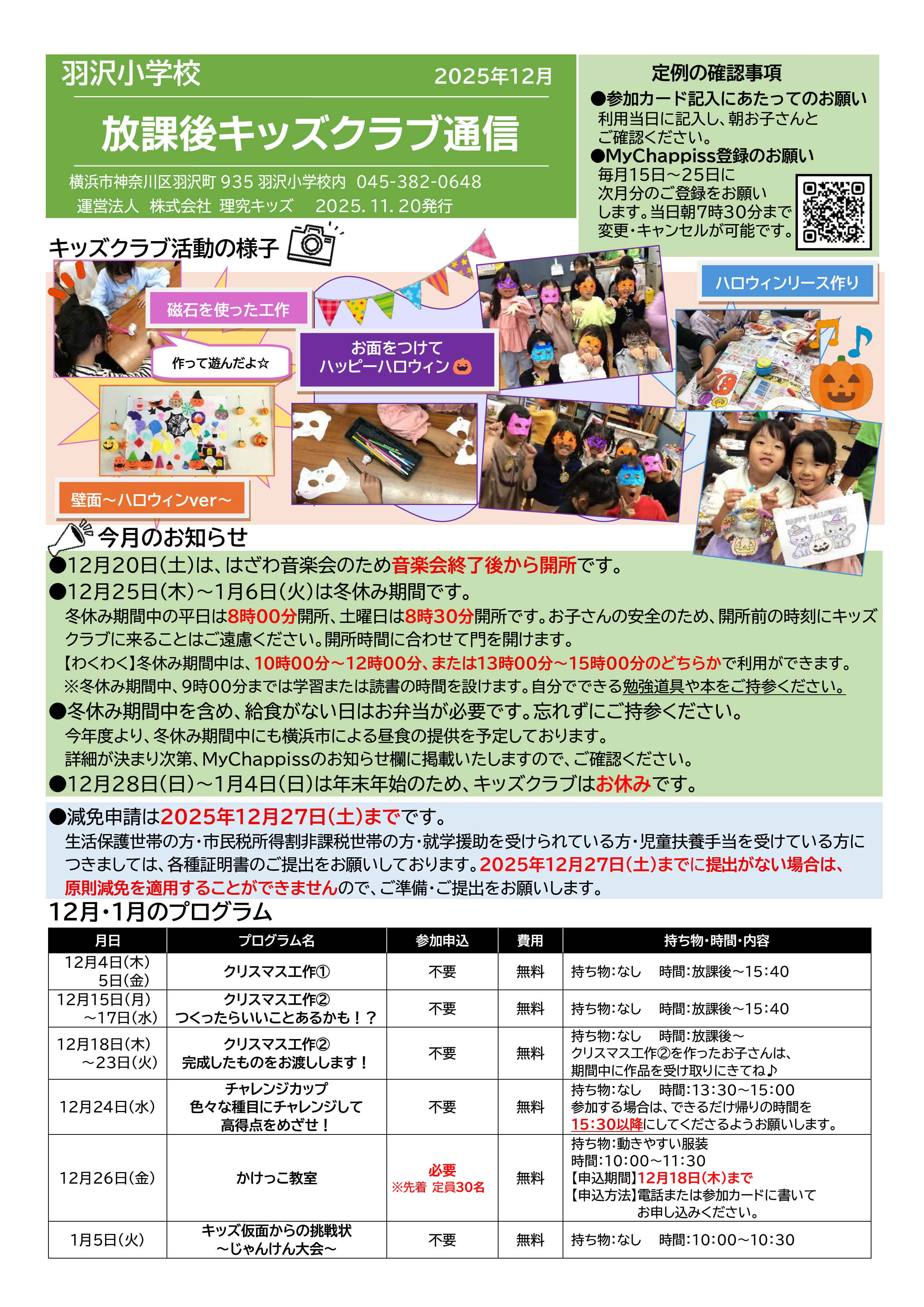 ※交通機関が不通となる場合もありますので、できるだけ早いお迎えをお願いします。※特別警報発表時は帰宅の安全が確保されるまで、お子さんは利用区分にかかわらず、放課後キッズクラブで留め置きとなります。