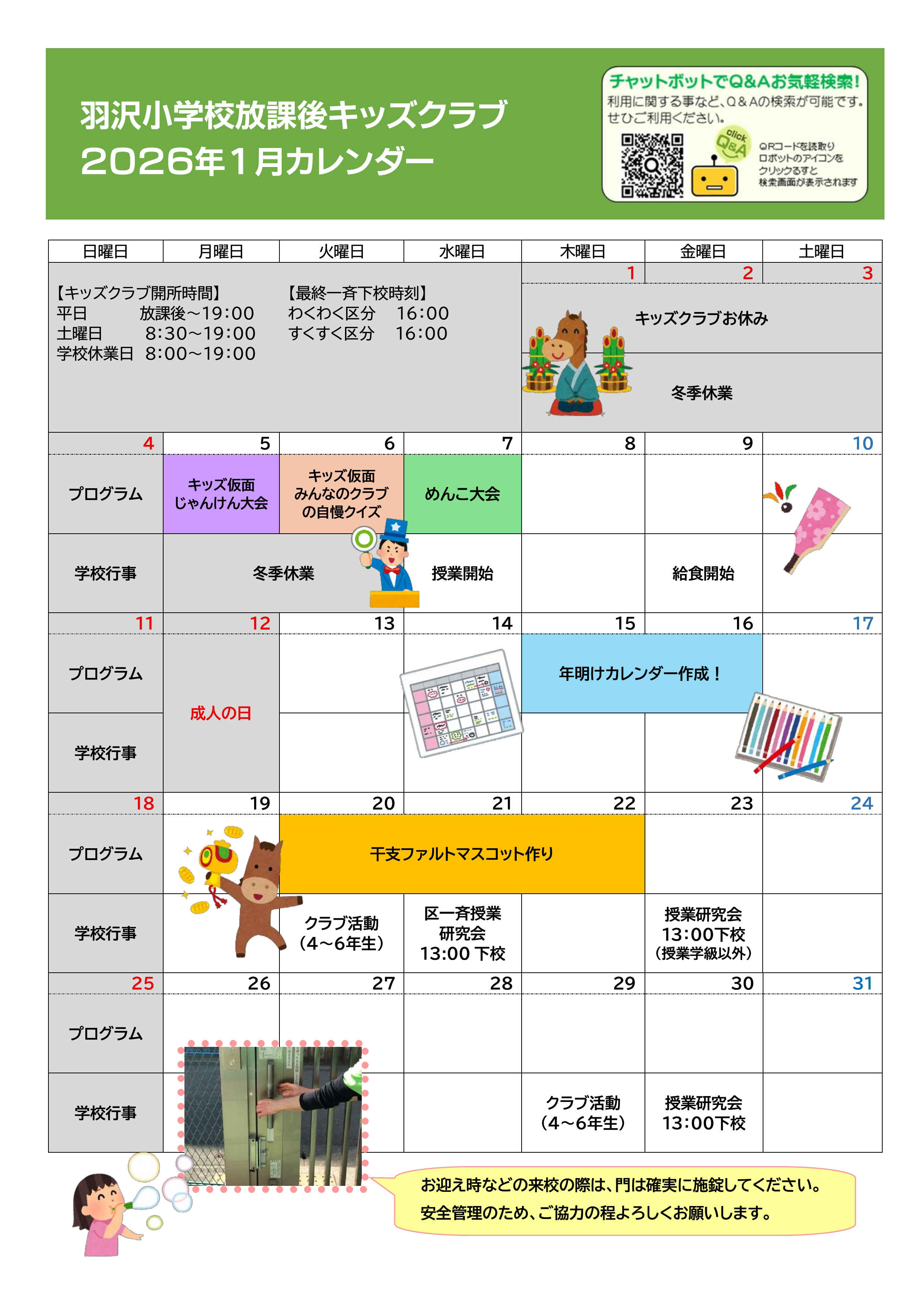 「暴風警報」・「大雪警報」・「暴風雪警報」・「降灰予報」発表中は、帰宅時刻に関わらず、利用しているすべてのお子さんの保護者か代理の方のお迎えが必要です。子どもたちはお迎えが来るまで放課後キッズクラブで待機します。